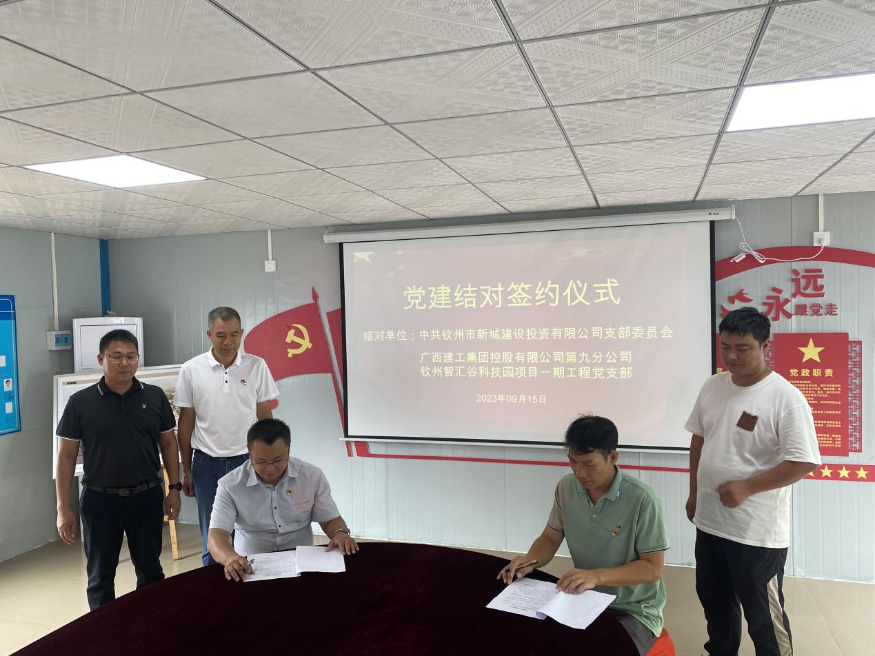 為充分發(fā)揮黨建引領作用,護航項目建設質量、安全生產(chǎn),促進市重點項目建設提速增效,2023年9月15日,建投公司黨支部與廣西建工集團欽州智匯谷科技園項目一期工程黨支部舉行黨建結對共建協(xié)議簽約儀式。集團公司副總經(jīng)理、建投公司黨支部書記劉雙,欽州智匯谷科技園項目一期工程項目經(jīng)理劉鐘明等出席簽約儀式并簽約。