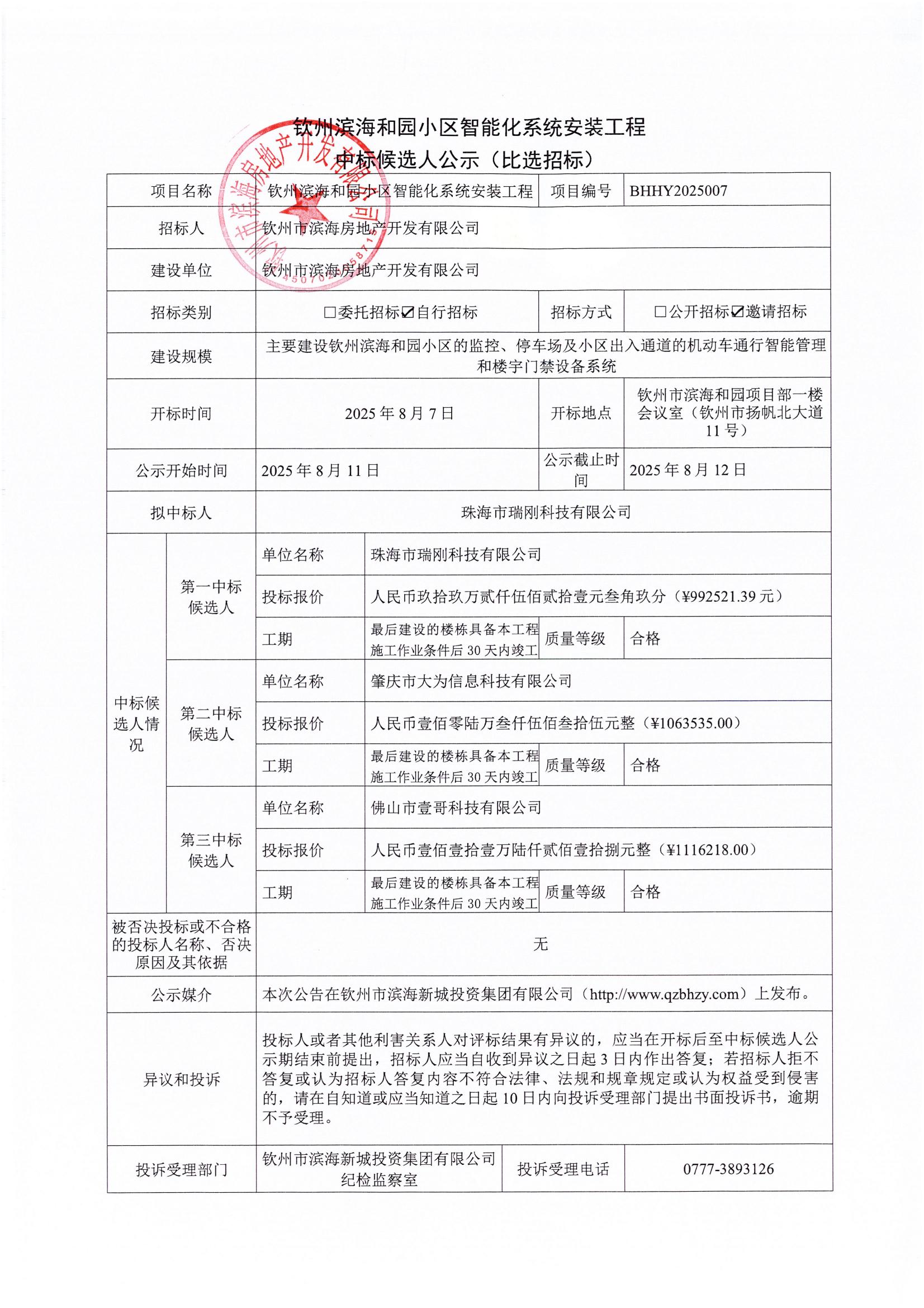 欽州濱海和園小區(qū)智能化系統(tǒng)安裝工程中標(biāo)候選人公示(比選招標(biāo))