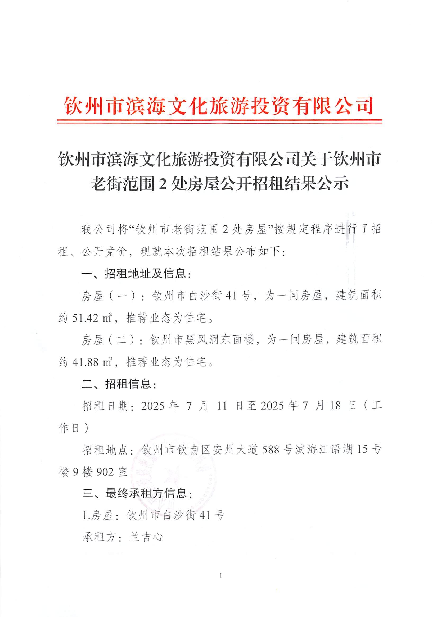 欽州市濱海文化旅游投資有限公司關(guān)于欽州市老街范圍2處房屋公開招租結(jié)果公示