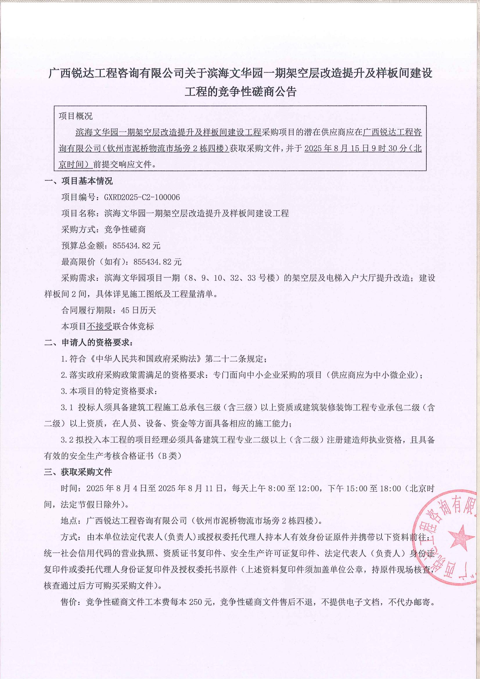 廣西銳達工程咨詢有限公司關(guān)于濱海文華園一期架空層改造提升及樣板間建設(shè)工程的競爭性磋商公告
