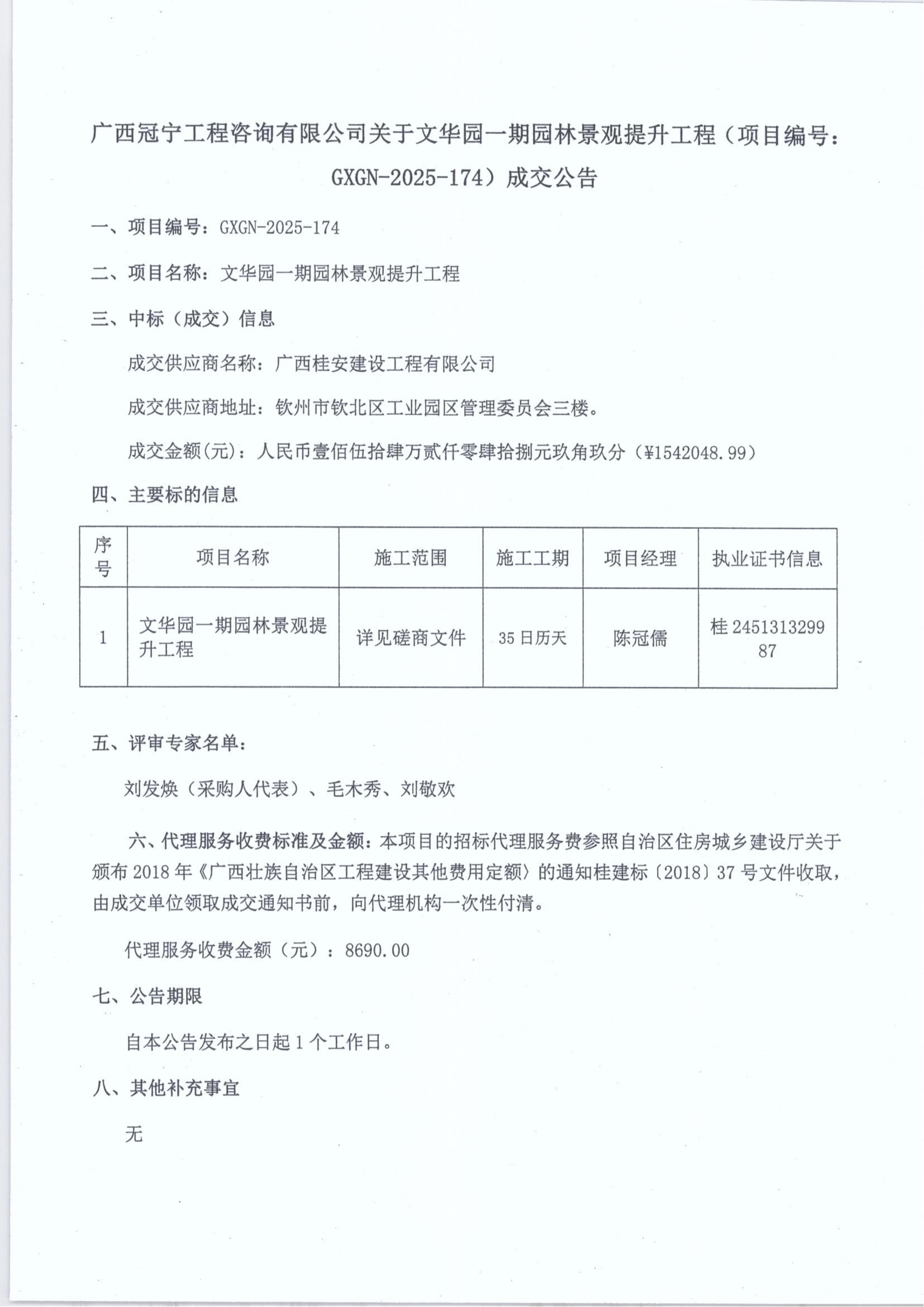 廣西冠寧工程咨詢有限公司關(guān)于文華園一期園林景觀提升工程(項目編號:GXGN-2025-174)成交公告