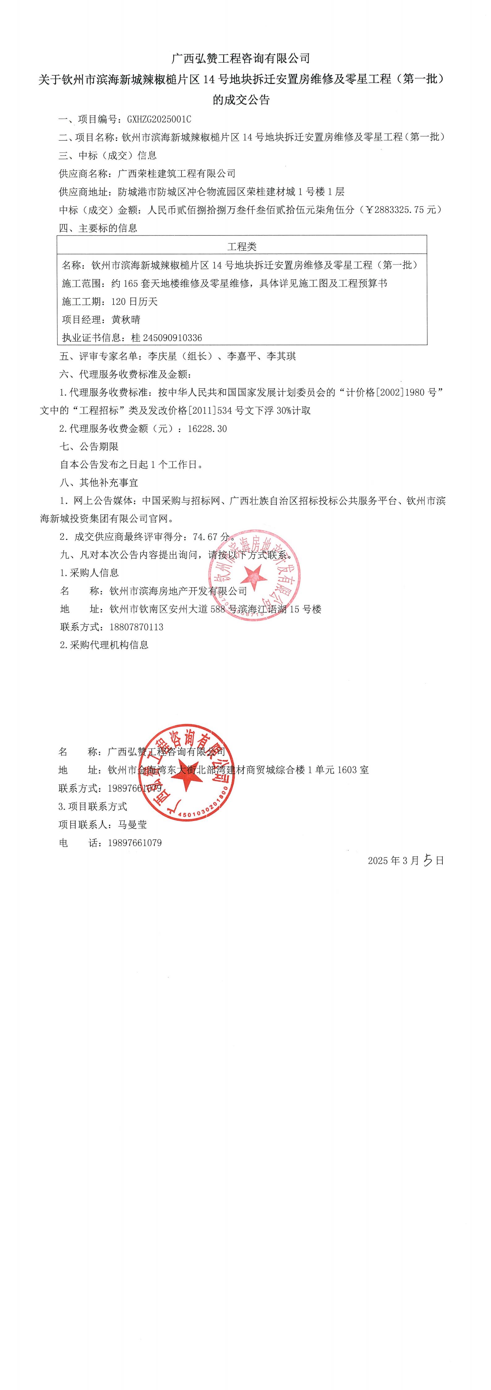 關于欽州市濱海新城辣椒槌片區(qū)14號地塊拆遷安置房維修及零星工程(第一批)的成交公告