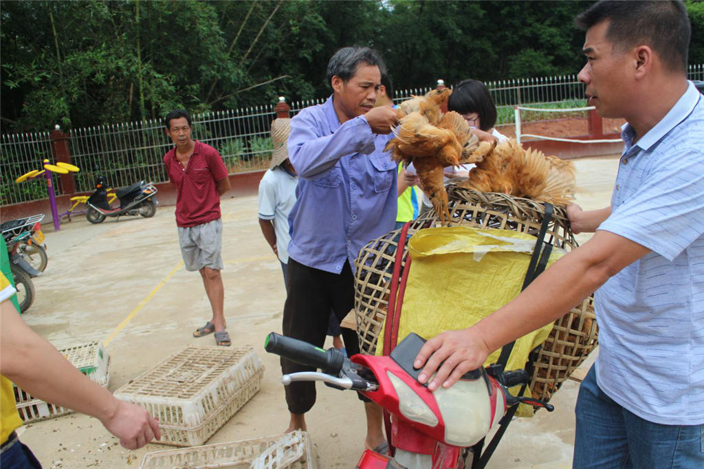 (圖為貧困戶將雞苗分裝到自備的雞籠里)