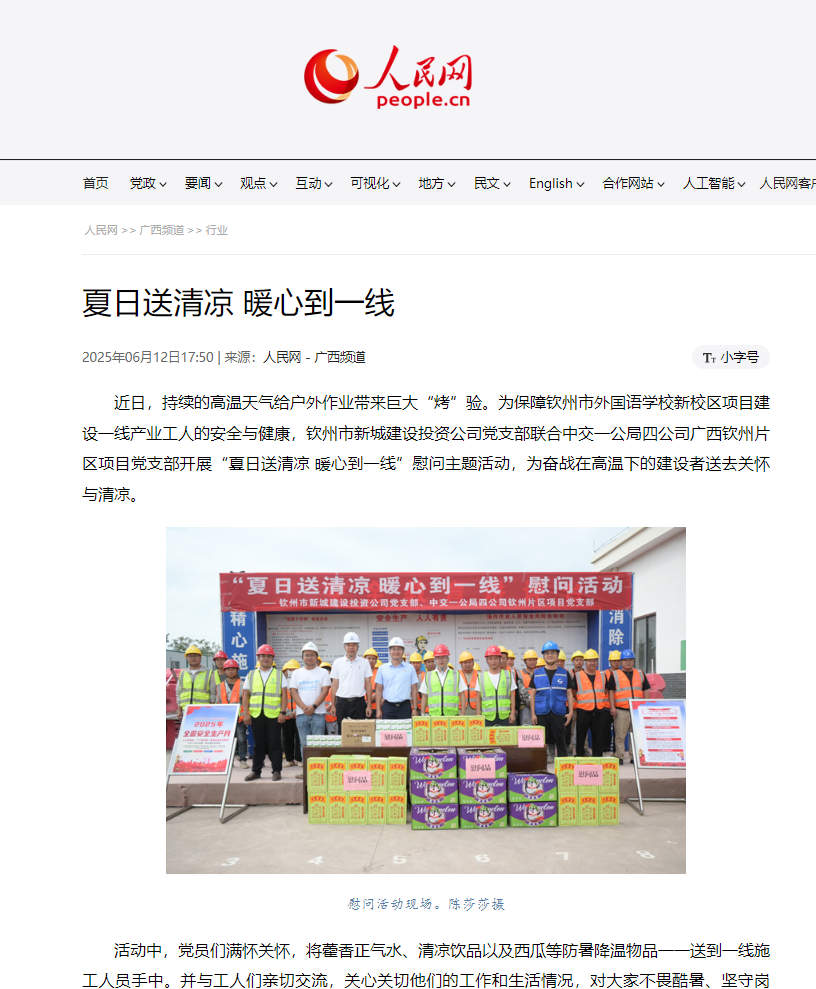 6月12日,人民網(wǎng)-廣西頻道以《夏日送清涼 暖心到一線》為題報道市濱投集團公司黨委下屬建投公司黨支部聯(lián)合中交一公局四公司廣西欽州片區(qū)項目黨支部開展“夏日送清涼 暖心到一線”慰問主題活動,為奮戰(zhàn)在高溫下的建設者送去關(guān)懷與清涼,全文如下。