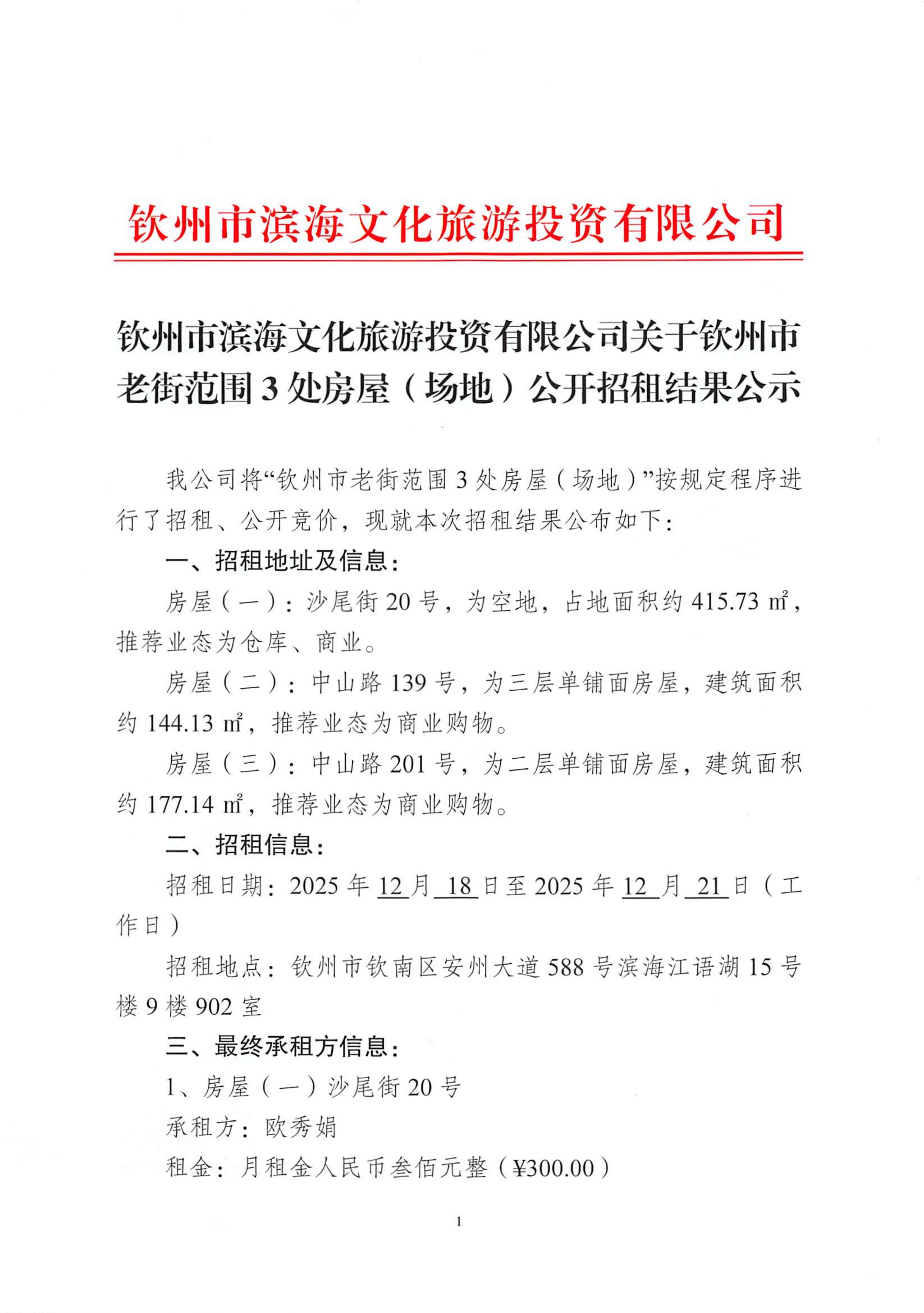 欽州市濱海文化旅游投資有限公司關于欽州市老街范圍3處房屋(場地)公開招租結果公示(沙尾街20號、中山路139號、中山路201號)
