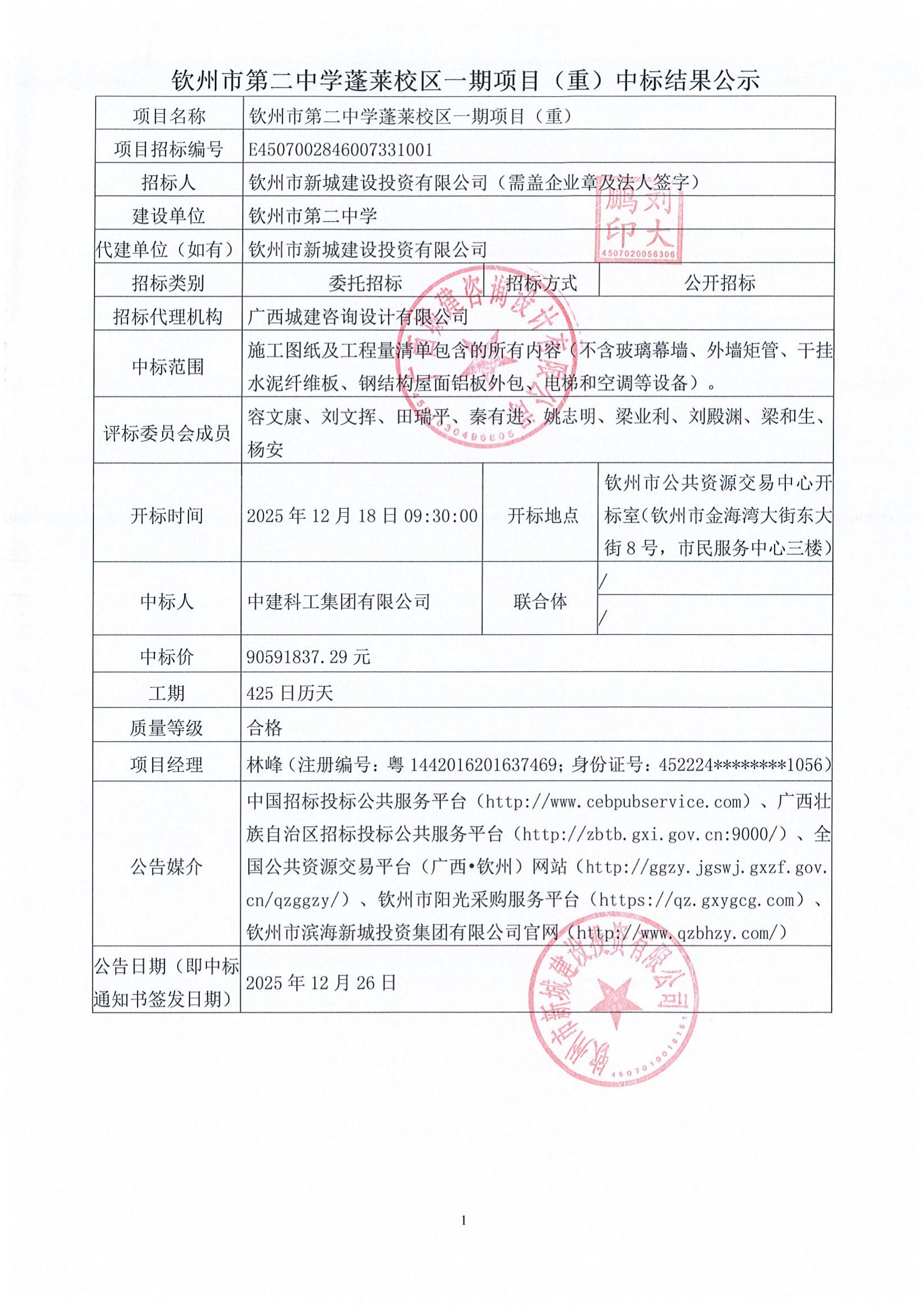 欽州市第二中學蓬萊校區(qū)一期項目(重)中標結果公示