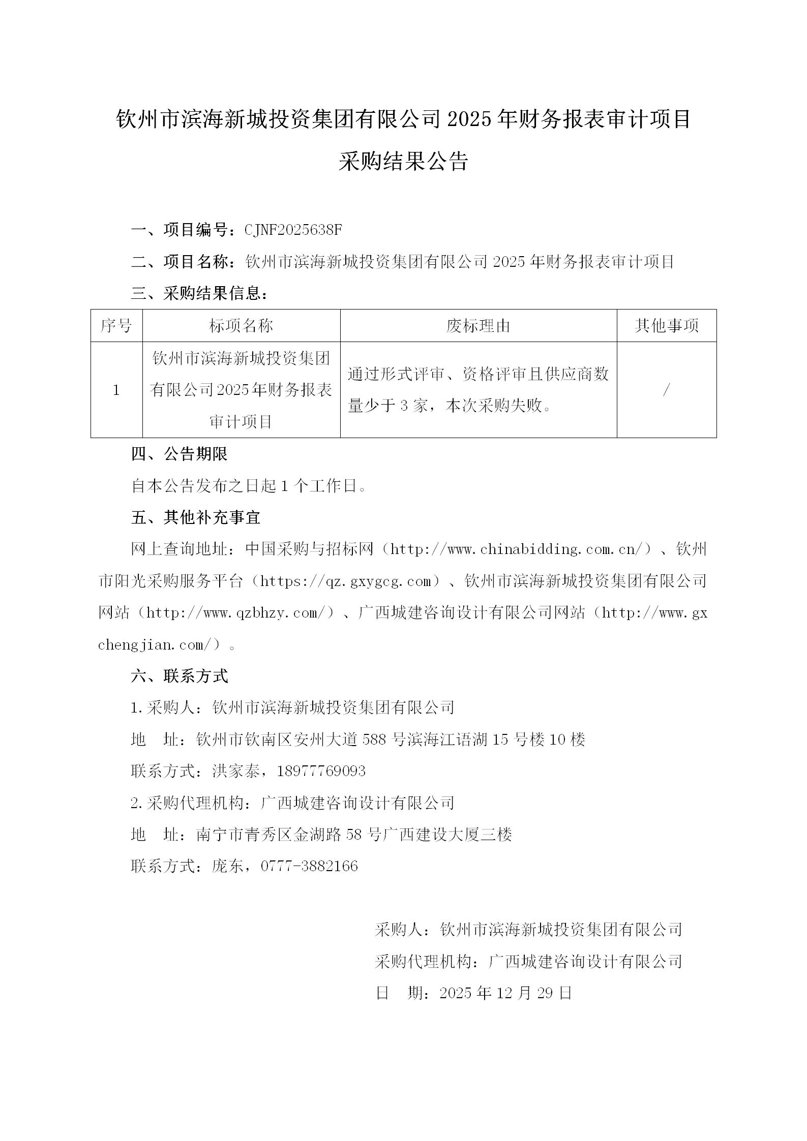 欽州市濱海新城投資集團有限公司2025年財務報表審計項目采購結果公告
