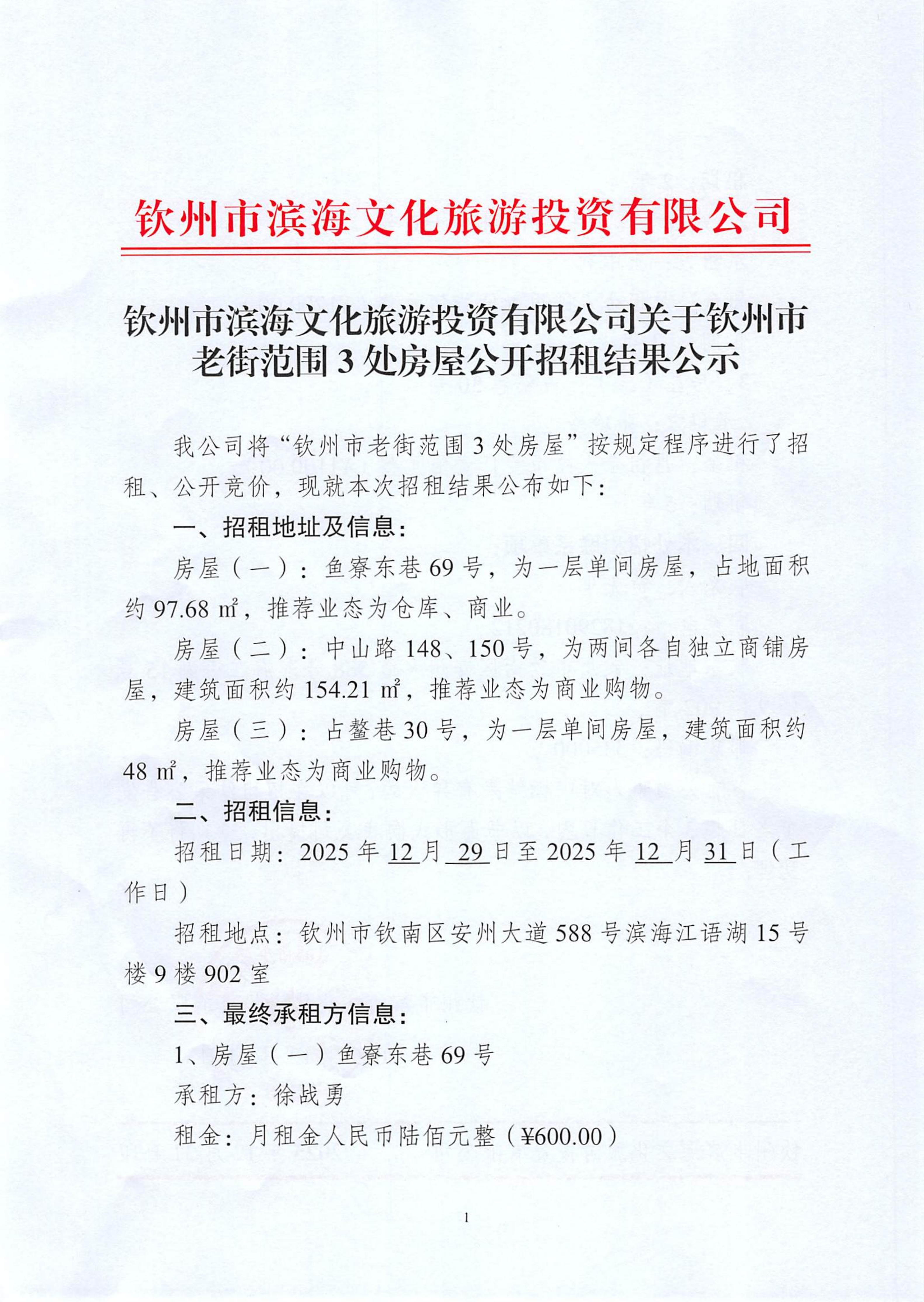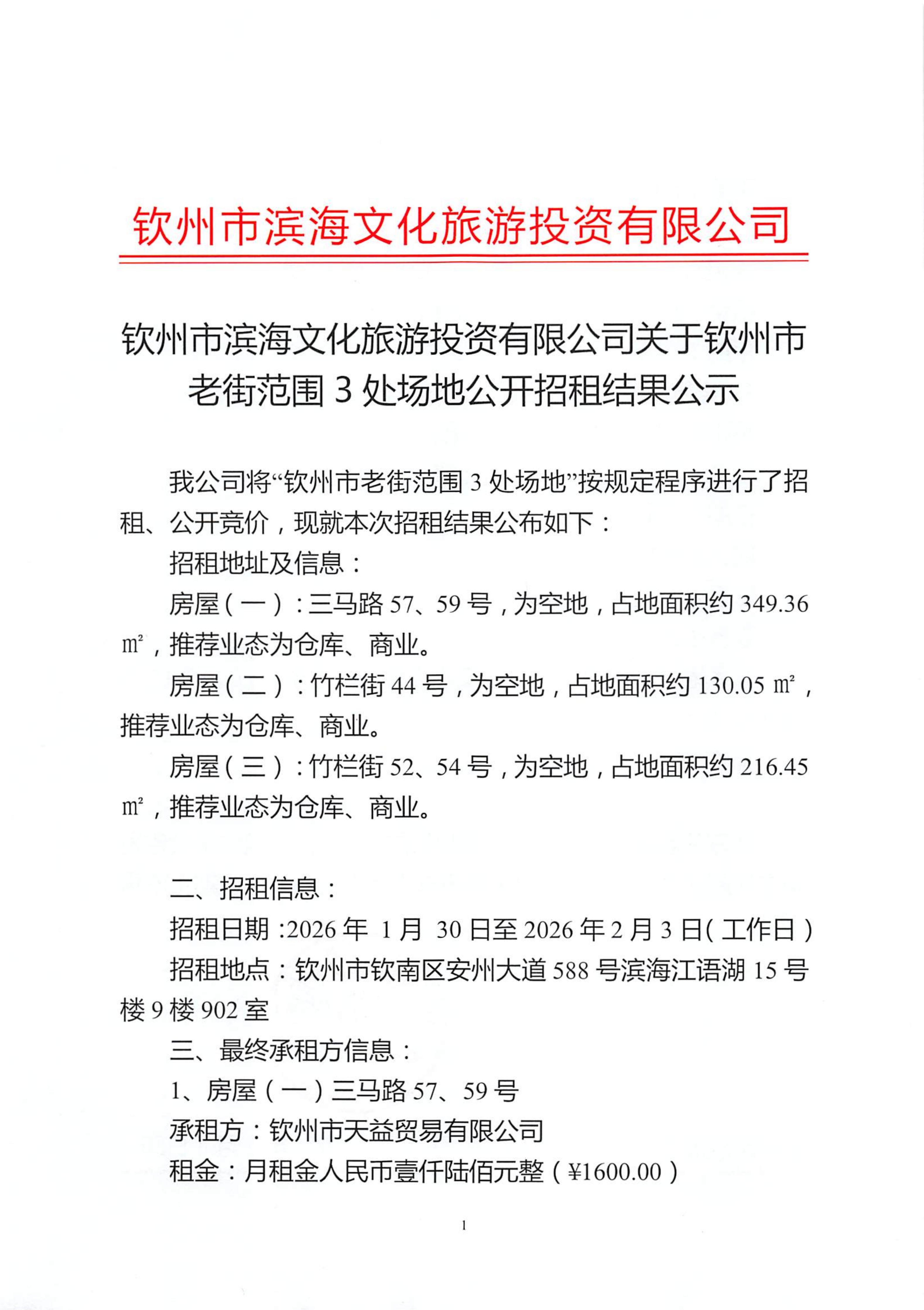 欽州市濱海文化旅游投資有限公司關于欽州市老街范圍3處房屋公開招租結果公示