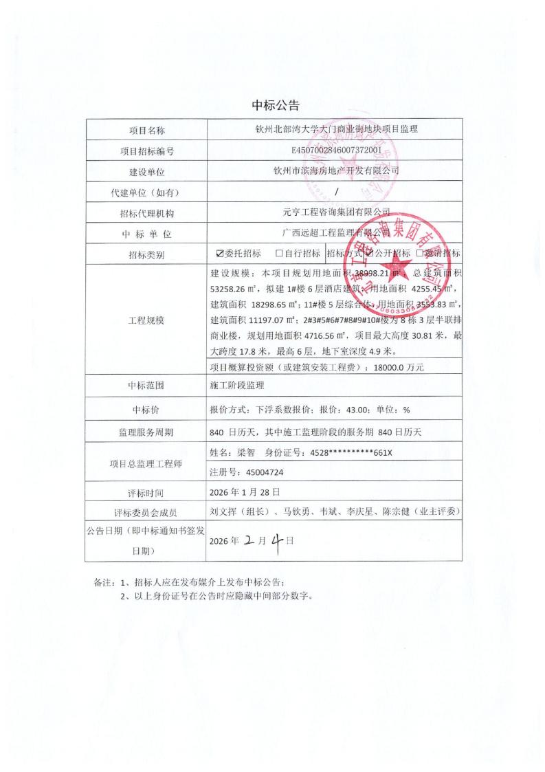 中標候選人公示(欽州北部灣大學大門商業(yè)街地塊項目監(jiān)理)