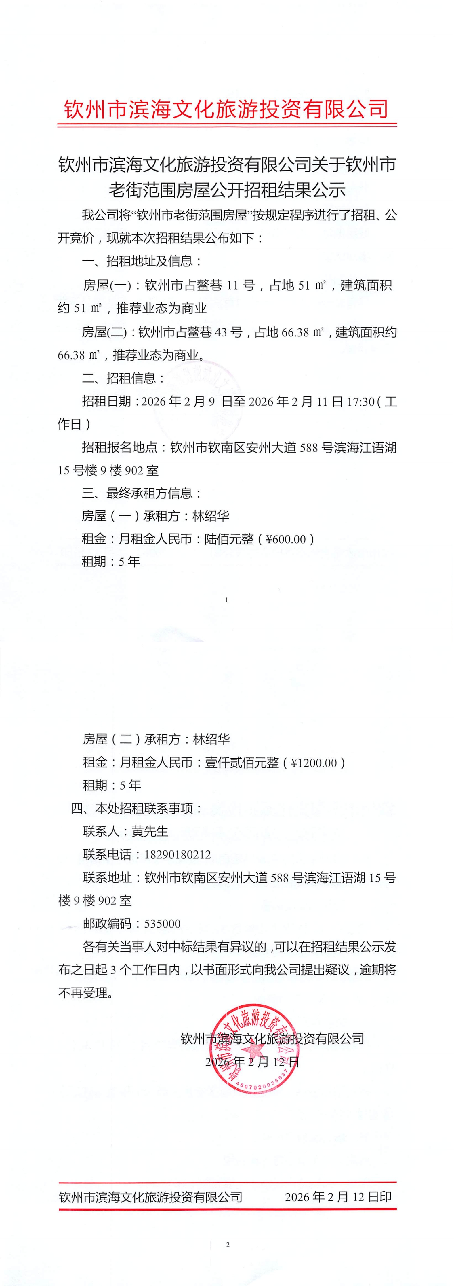 欽州市濱海文化旅游投資有限公司關于欽州市老街范圍2處房屋公開招租結果公示