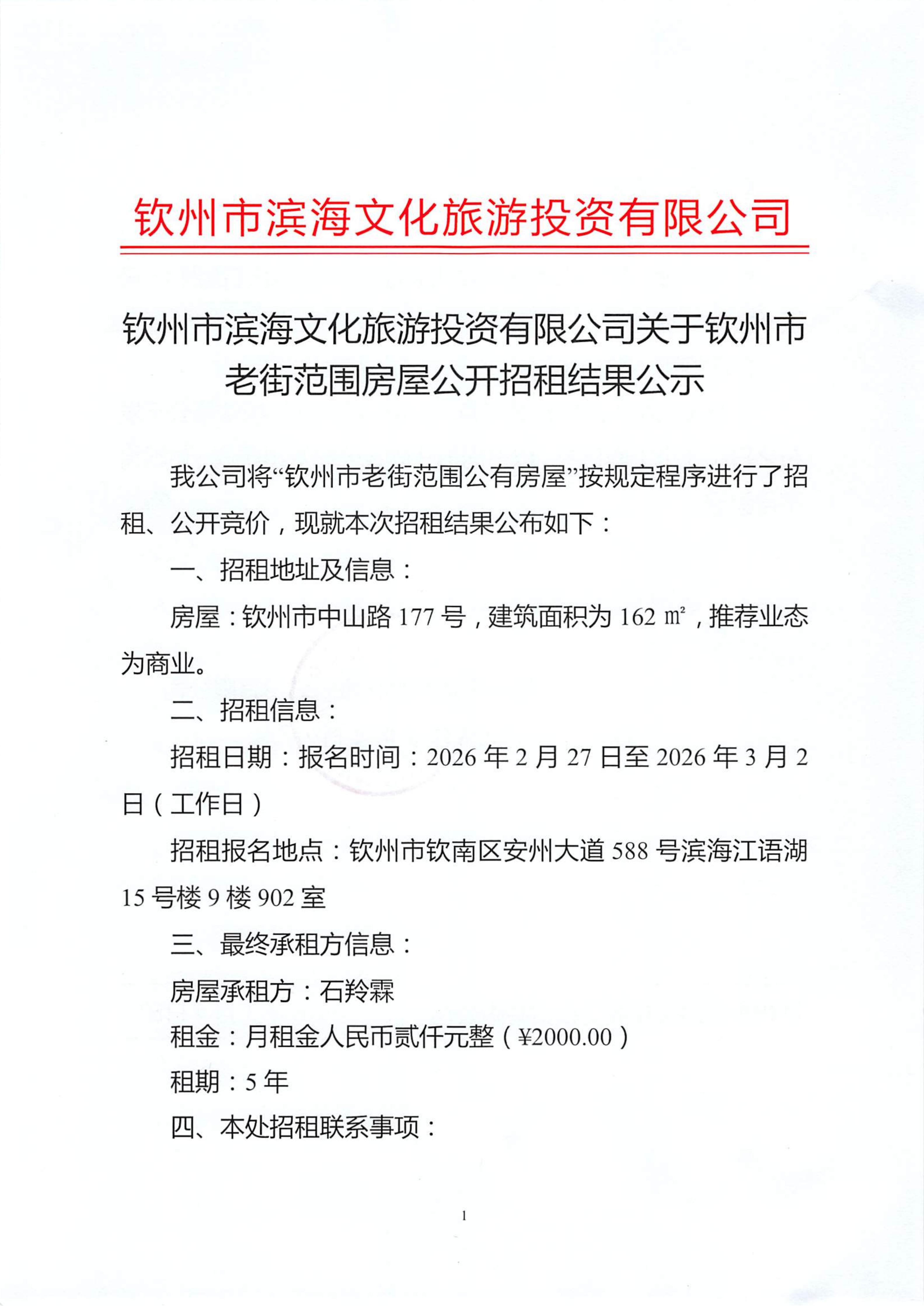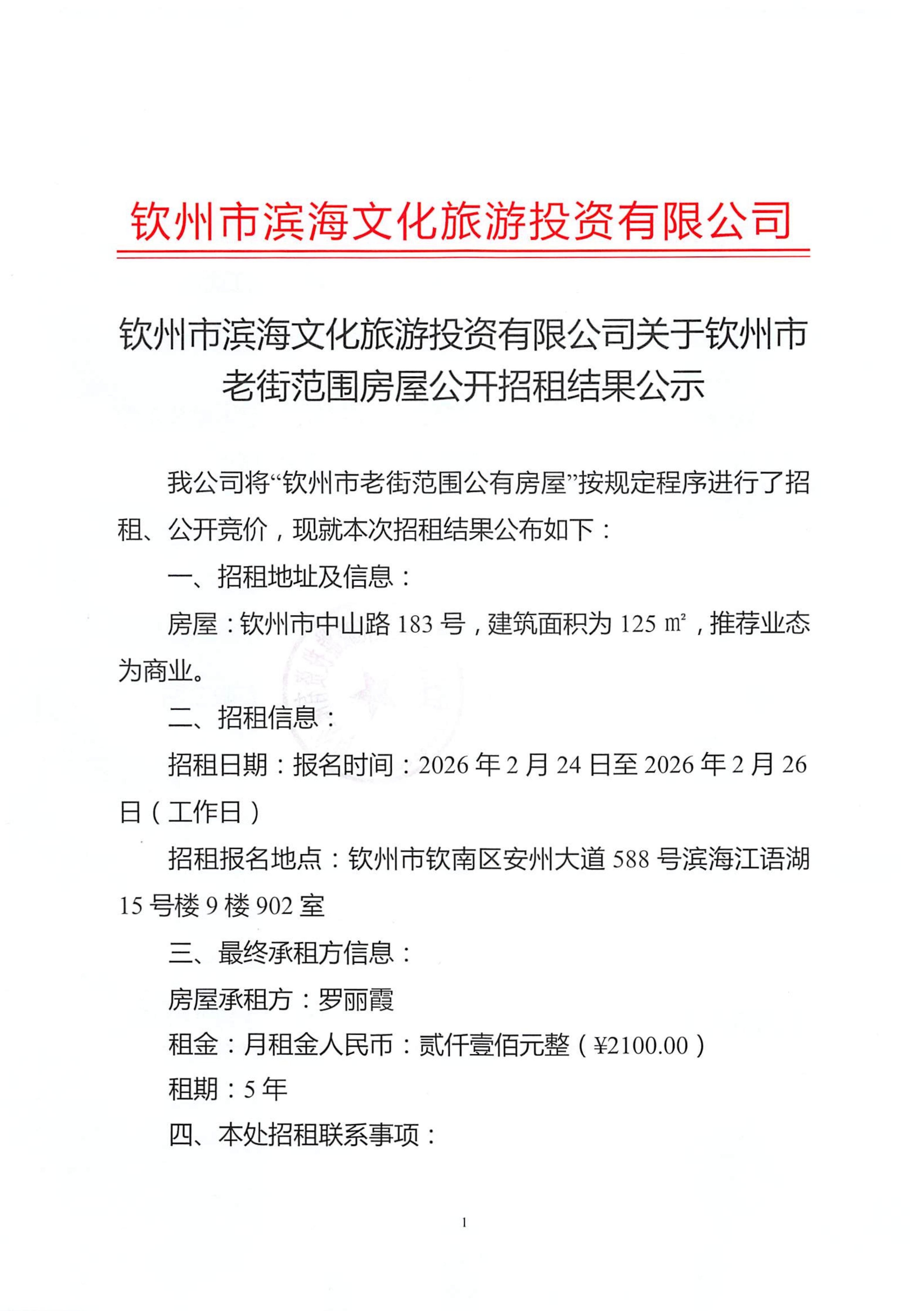 欽州市濱海文化旅游投資有限公司關(guān)于欽州市老街范圍房屋公開招租結(jié)果公示(欽州市中山路183號)