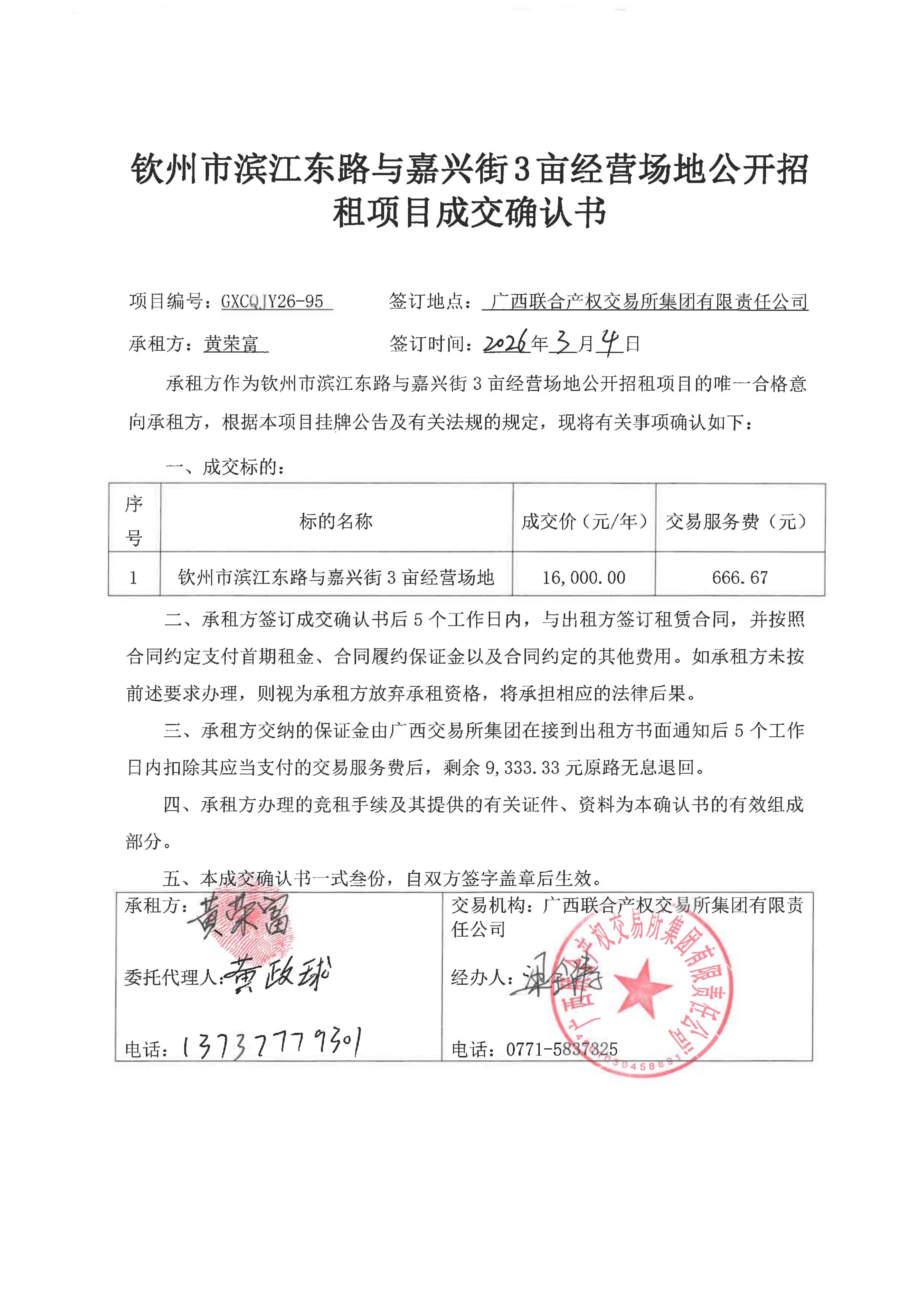 欽州市濱江東路與嘉興街3畝經(jīng)營場地公開招租項目成交確認(rèn)書