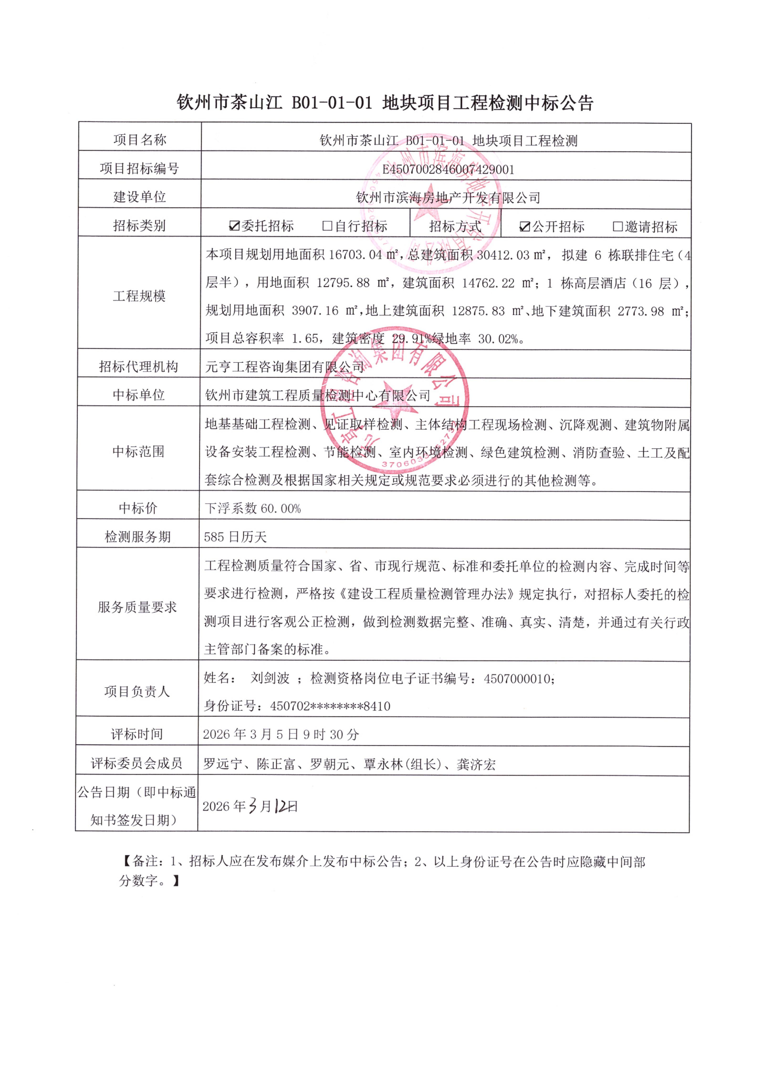 欽州市茶山江 B01-01-01地塊項目工程檢測中標(biāo)公告
