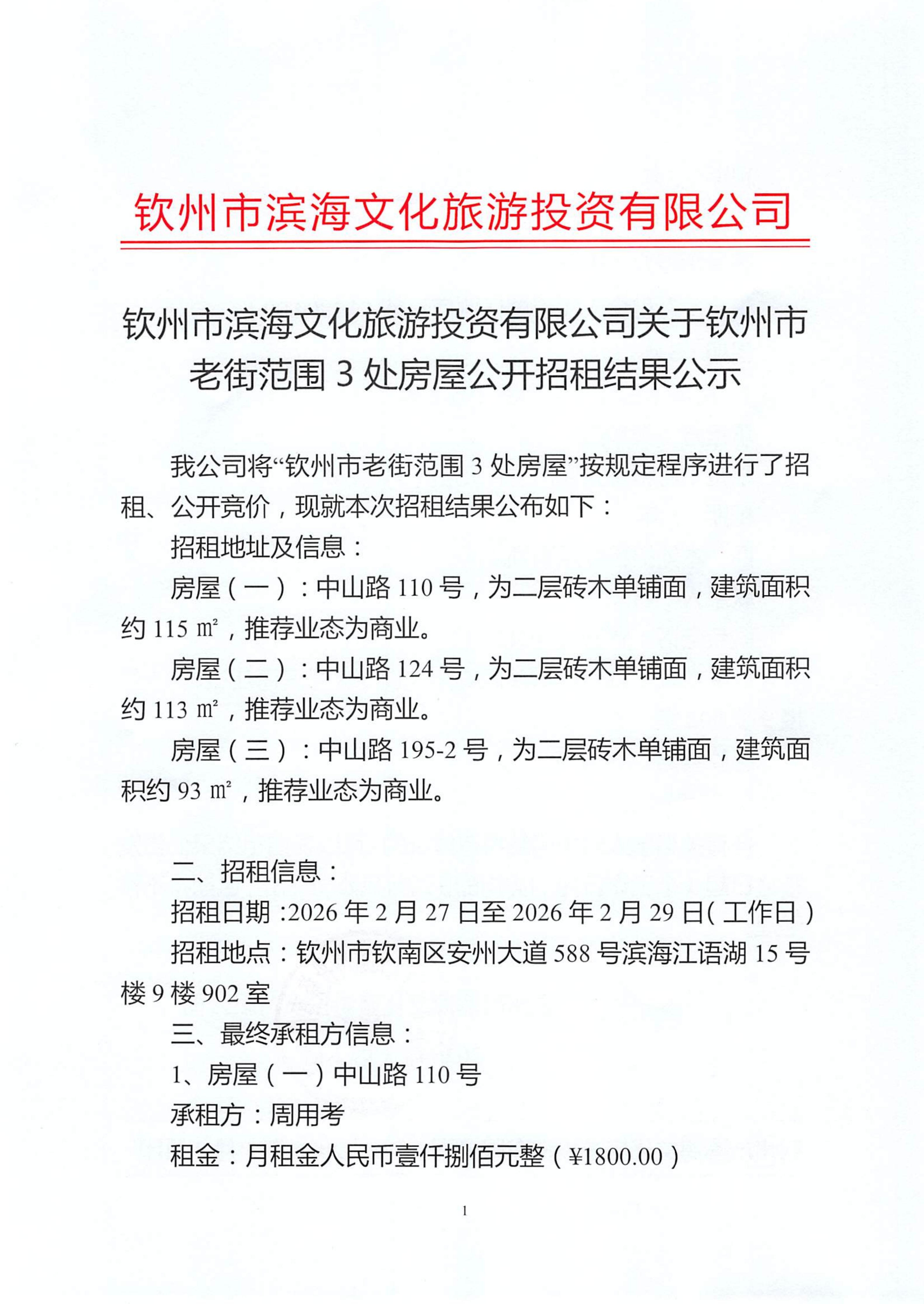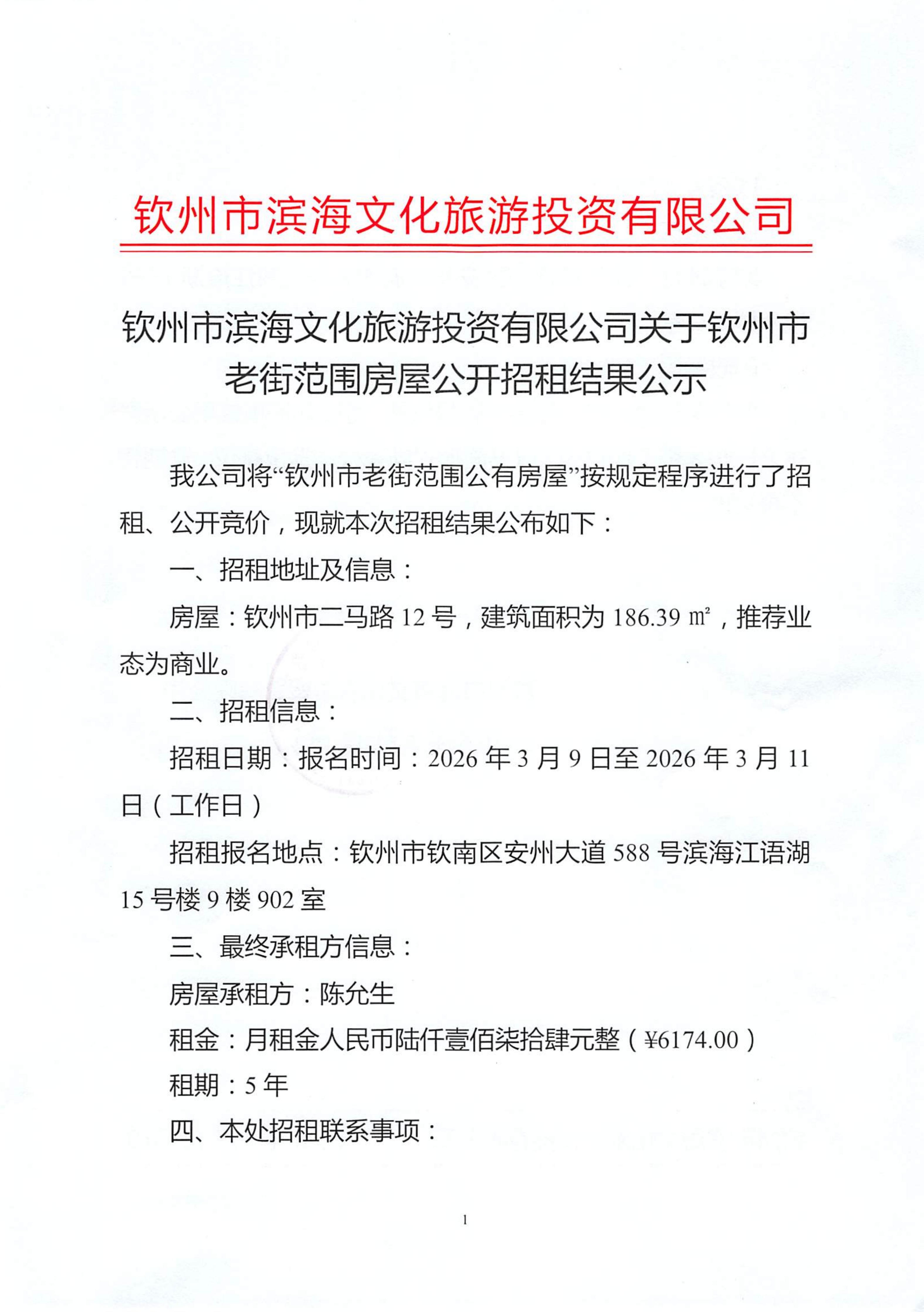 欽州市濱海文化旅游投資有限公司關(guān)于欽州市老街范圍3處公房公開招租結(jié)果公示(三馬路57、59號,竹欄街44號,竹欄街52、54號)
