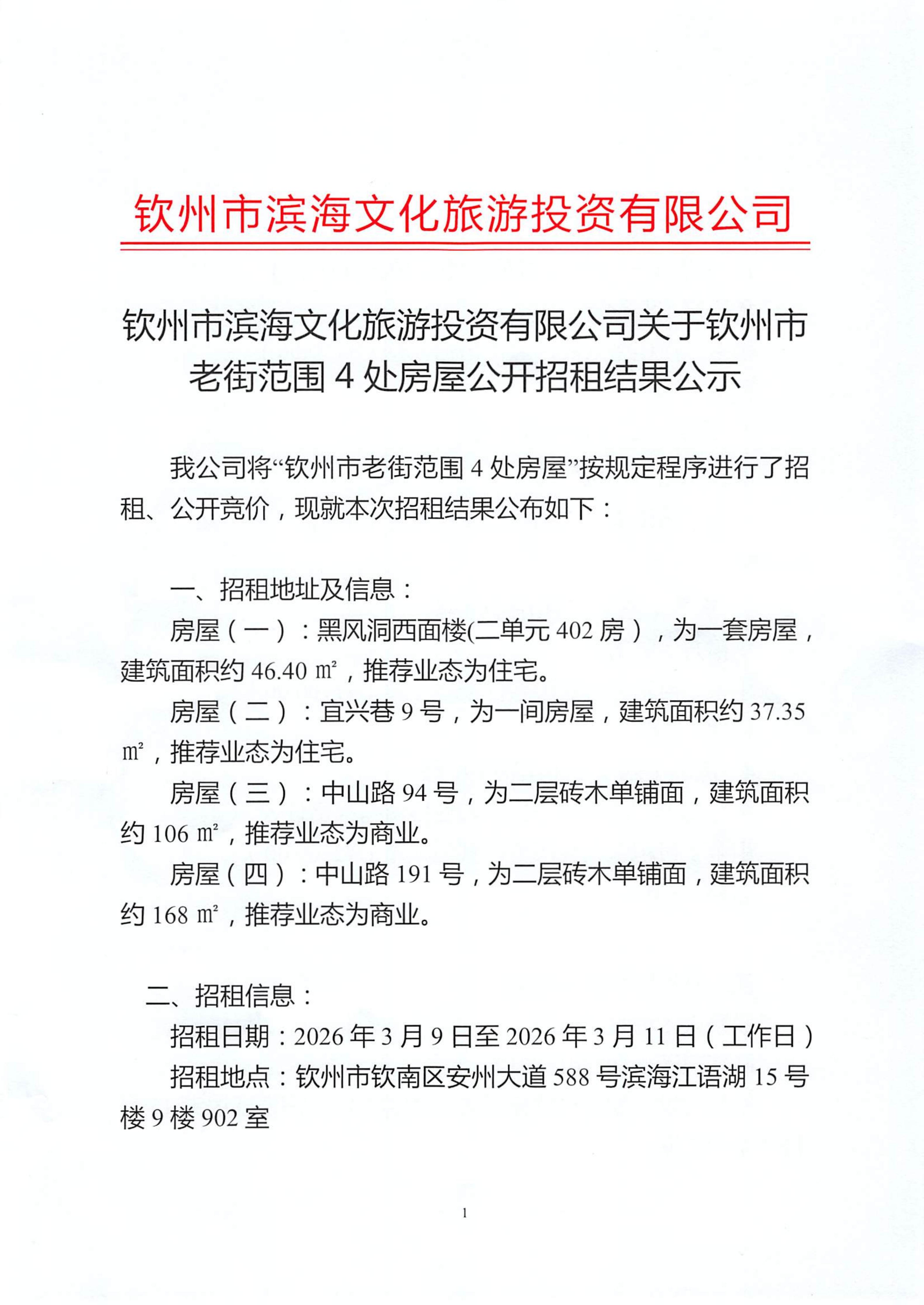 欽州市濱海文化旅游投資有限公司關(guān)于欽州市老街范圍4處房屋公開招租結(jié)果公示