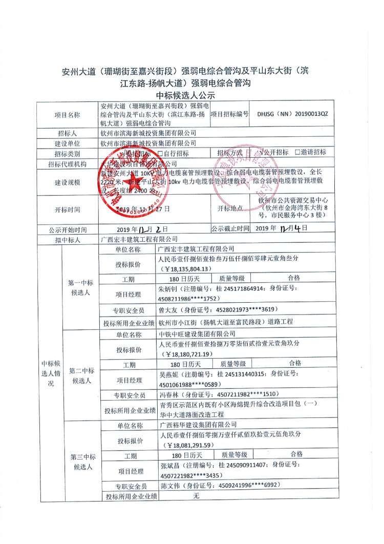 欽州市濱海新城嘉興街(嘉禾街-揚(yáng)帆大道)道路工程及嘉興街(揚(yáng)帆大道-安州大道)地下綜合管廊項(xiàng)目、欽州市公安局沙埠派出所項(xiàng)目、欽州市濱海新城安州大道中段與環(huán)城南路交叉路口工程綜合檢測中標(biāo)候選人公示 項(xiàng)目名稱 欽州市濱海新城嘉興街(嘉禾街-揚(yáng)帆大道)道路工程及嘉興街(揚(yáng)帆大道-安州大道)地下綜合管廊項(xiàng)目、欽州市公安局沙埠派出所項(xiàng)目、欽州市濱海新...