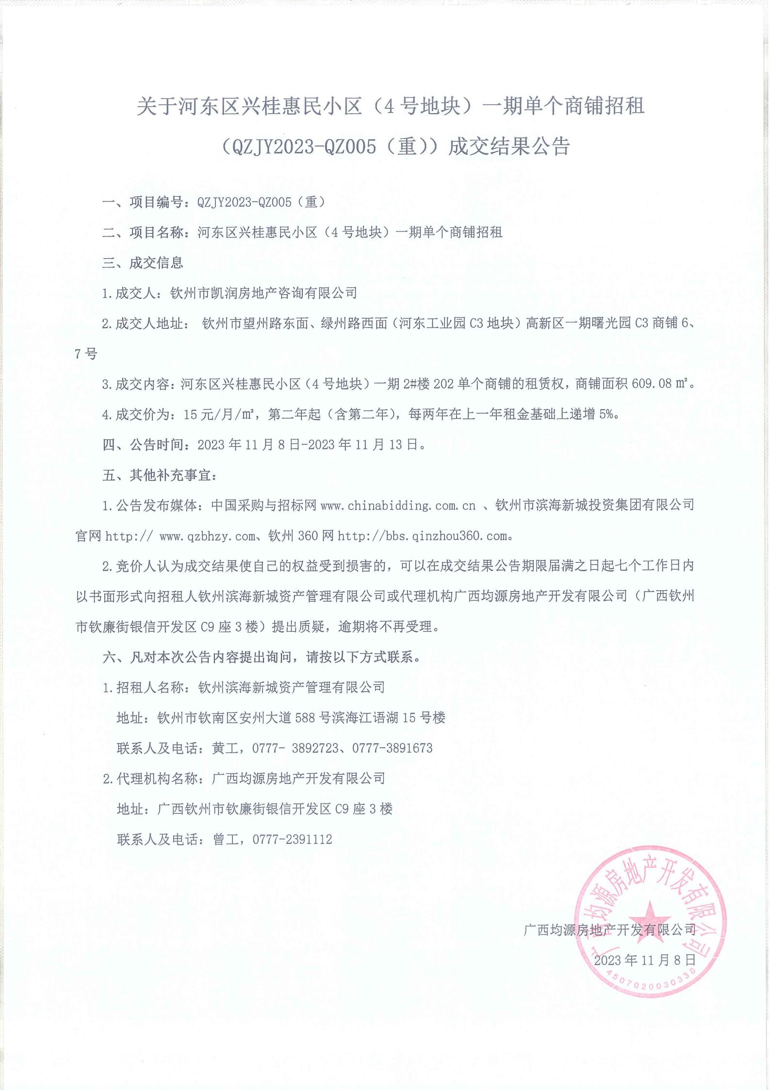 河?xùn)|區(qū)興桂惠民小區(qū)(4號地塊)一期單個(gè)商鋪招租(qzjy2023-qz005(重))成交結(jié)果公告
