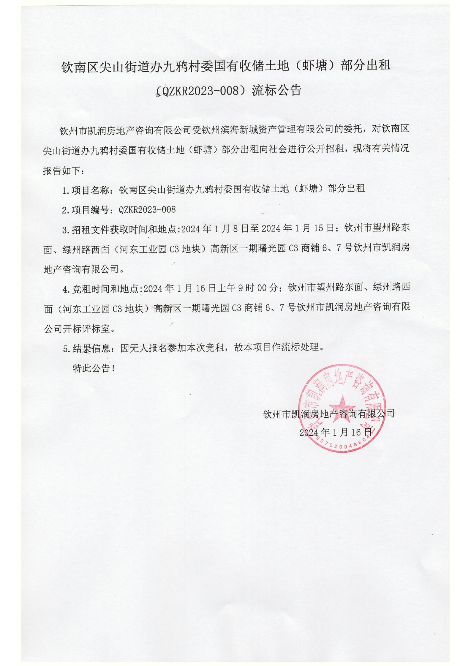 欽南區(qū)尖山街道辦九鴉村委國有收儲(chǔ)土地(蝦塘)部分出租(QZKR2023-008)流標(biāo)公告