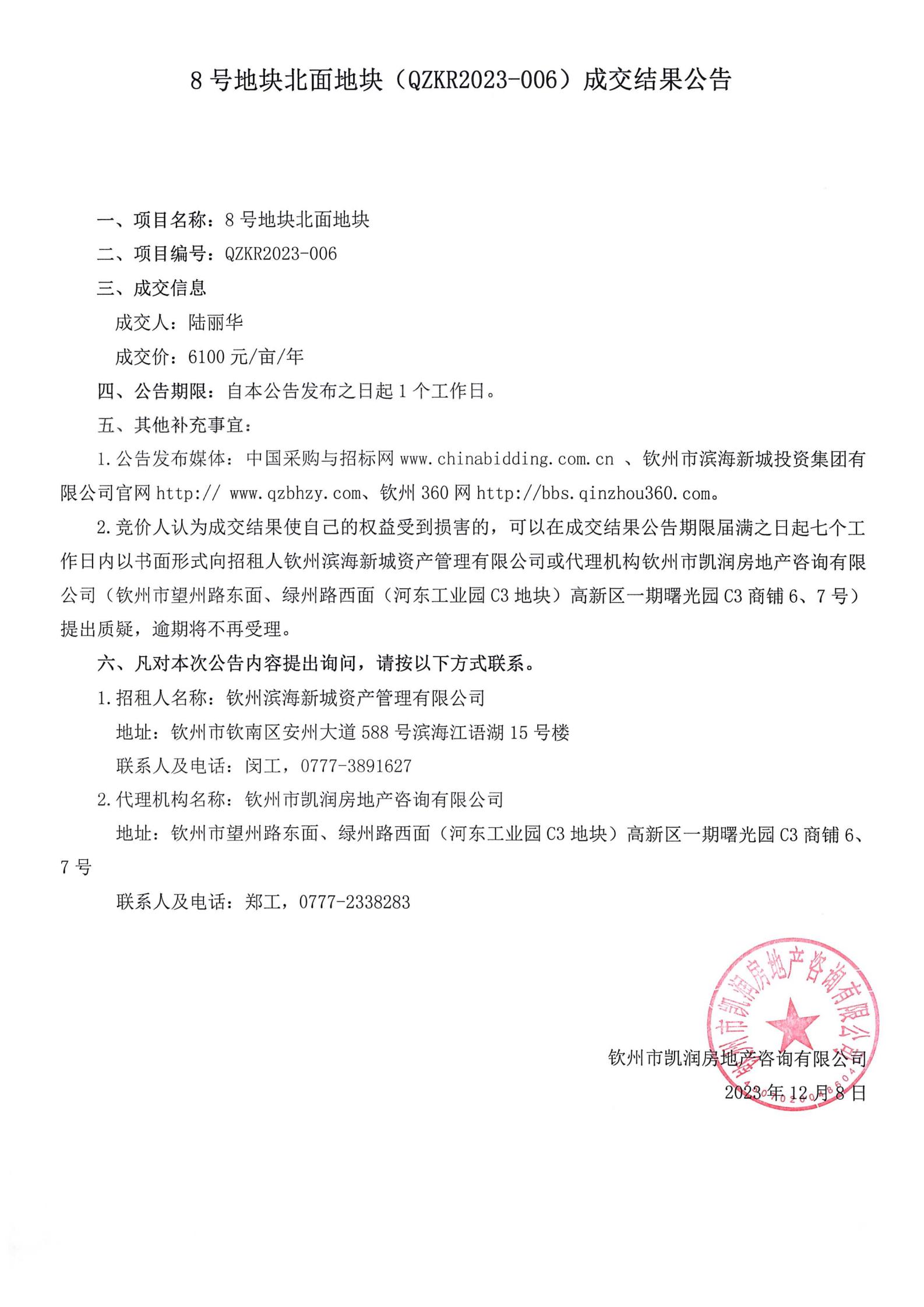 8號地塊北面地塊(QZKR2023-006)成交結(jié)果公告
