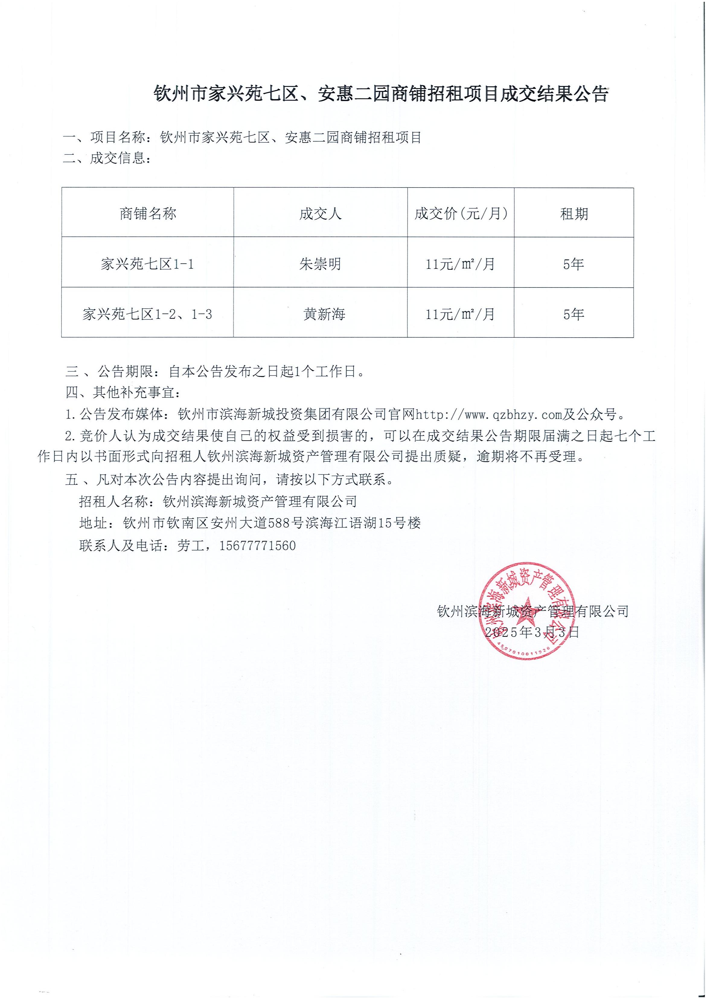 欽州市家興苑七區(qū)、安惠二園商鋪招租項目成交結果公告