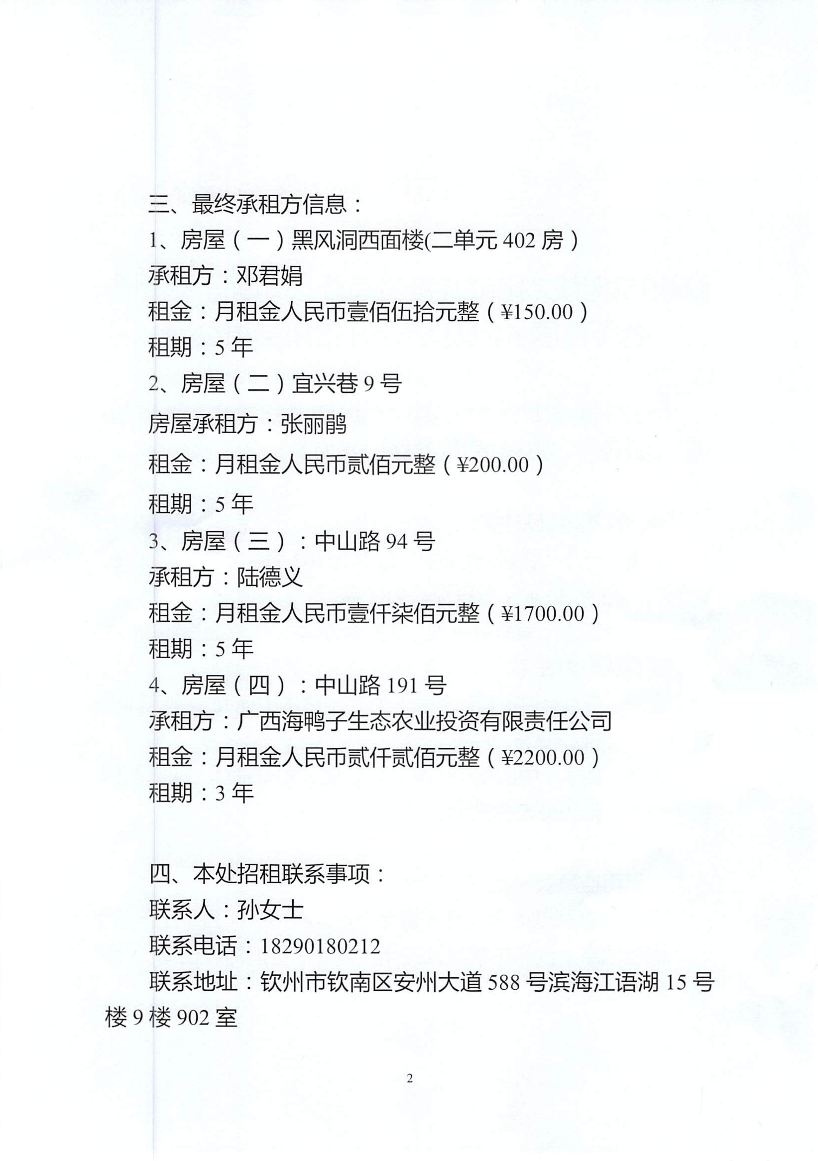 欽州市濱海文化旅游投資有限公司關于欽州市老街范圍房屋公開招租結果公示