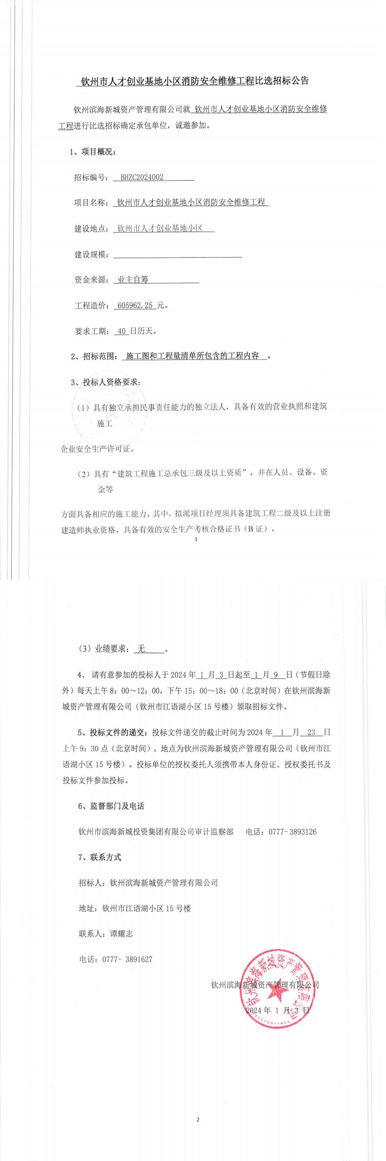 欽州市人才創(chuàng)業(yè)基地小區(qū)消防安全維修工程比選招標(biāo)公告