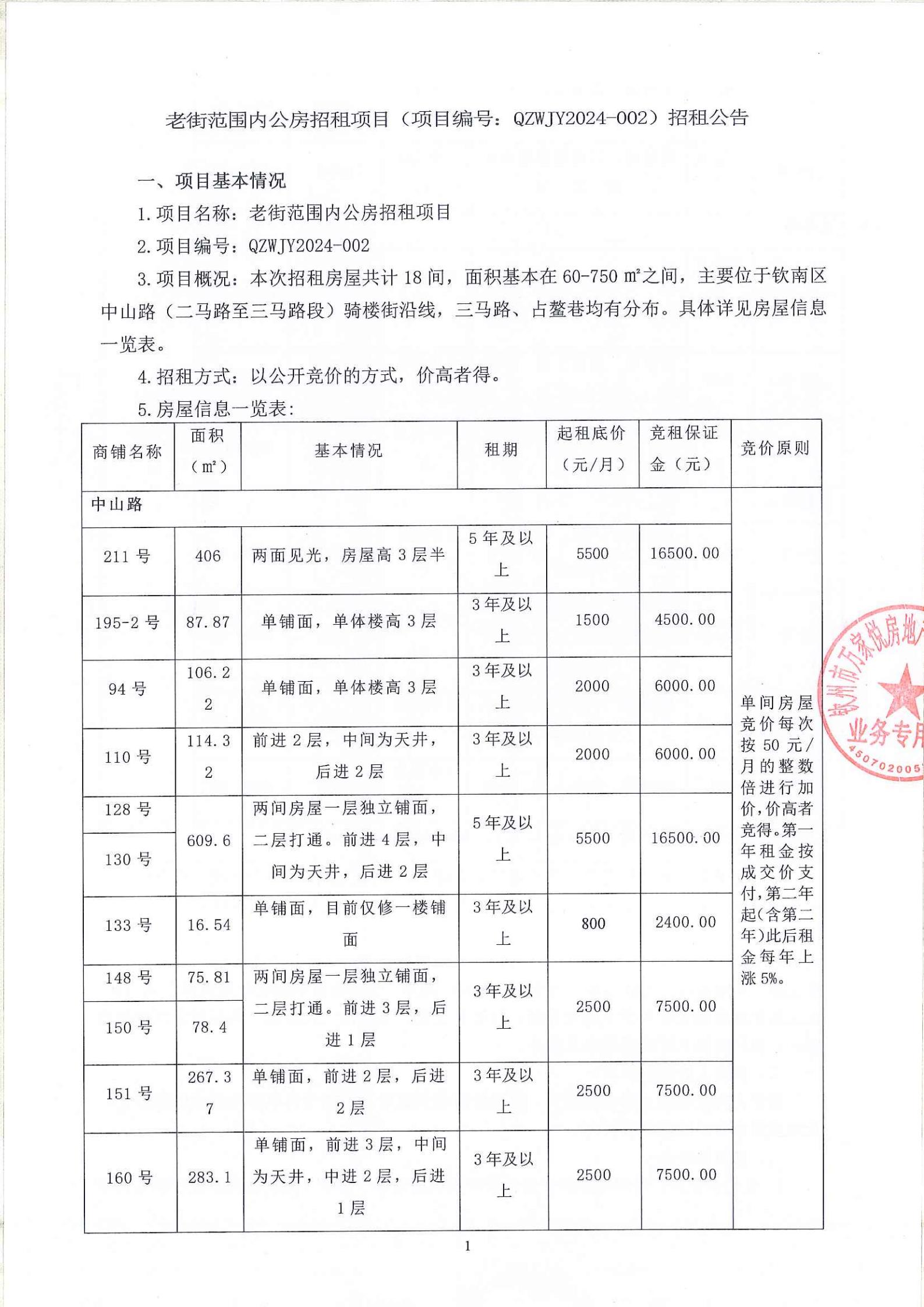 老街范圍內(nèi)公房招租項目(項目編號:QZWJY2024-001)招租公告