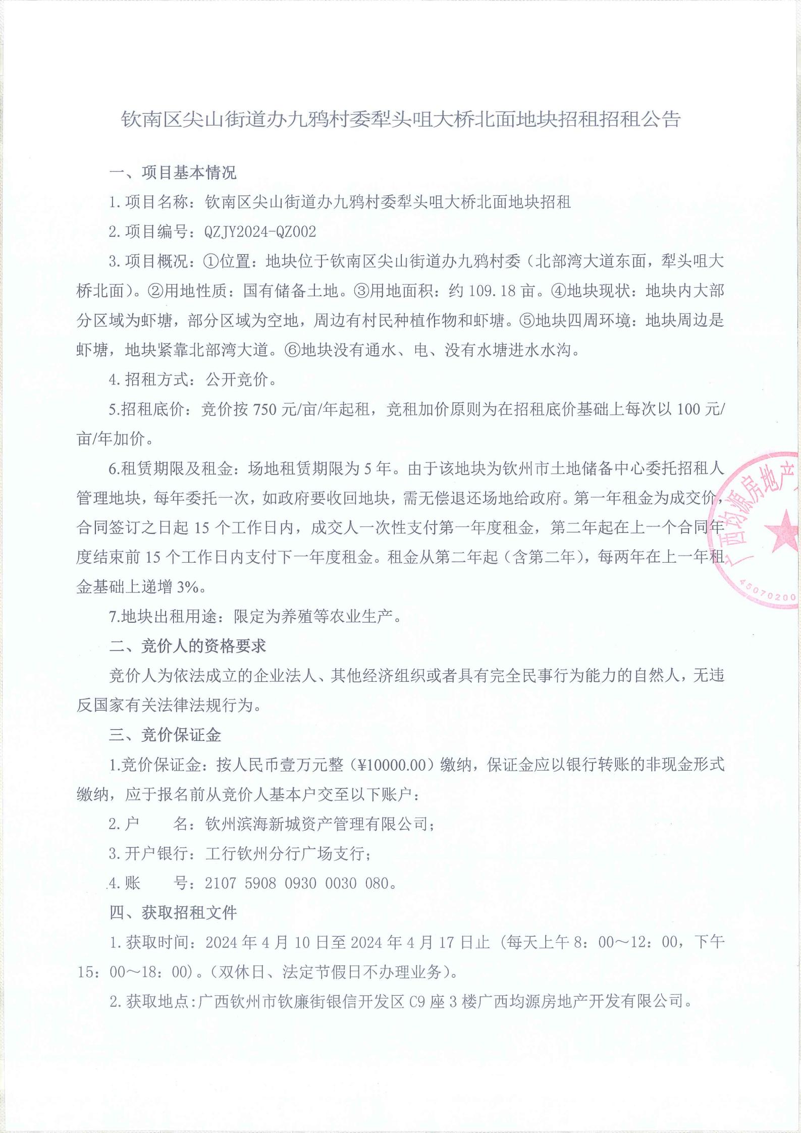 欽南區(qū)尖山街道辦九鴉村委國有收儲土地(蝦塘)部分出租招租公告