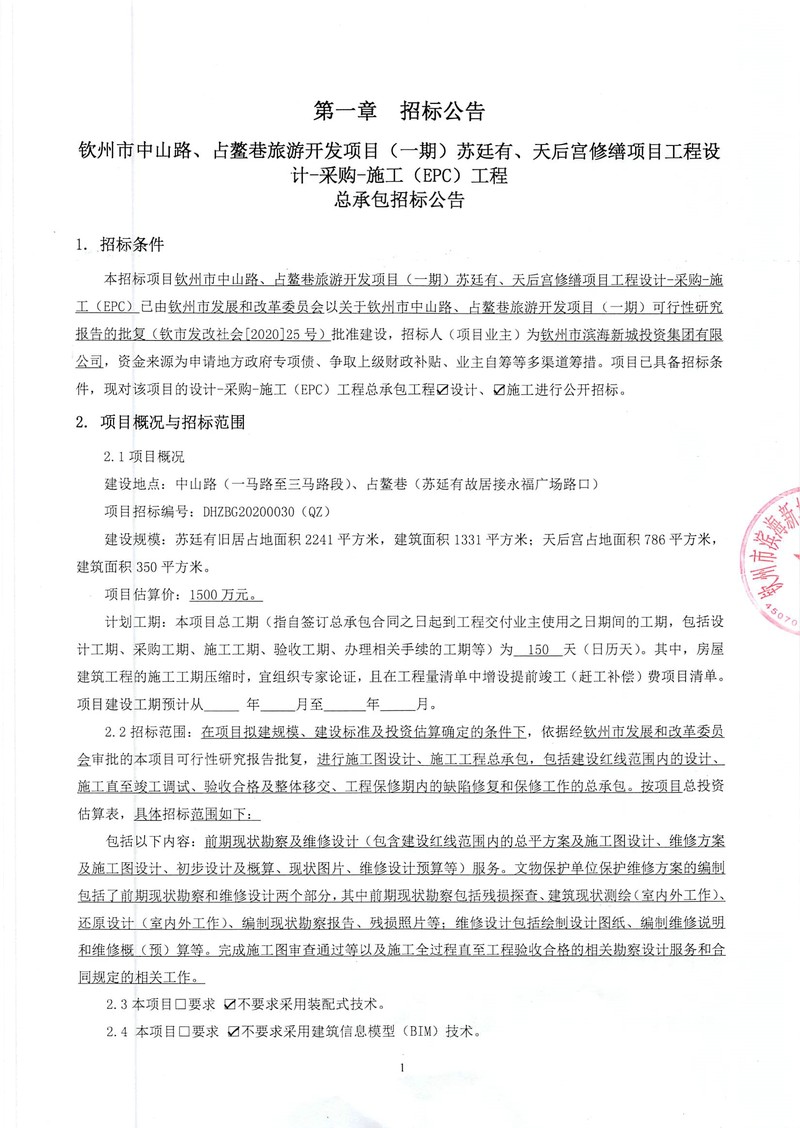 欽州市中山路、占鰲巷旅游開發(fā)項(xiàng)目(一期)蘇廷有、天后宮修繕項(xiàng)目工程設(shè)計(jì)-采購(gòu)-施工(EPC)工程總承包招標(biāo)公告