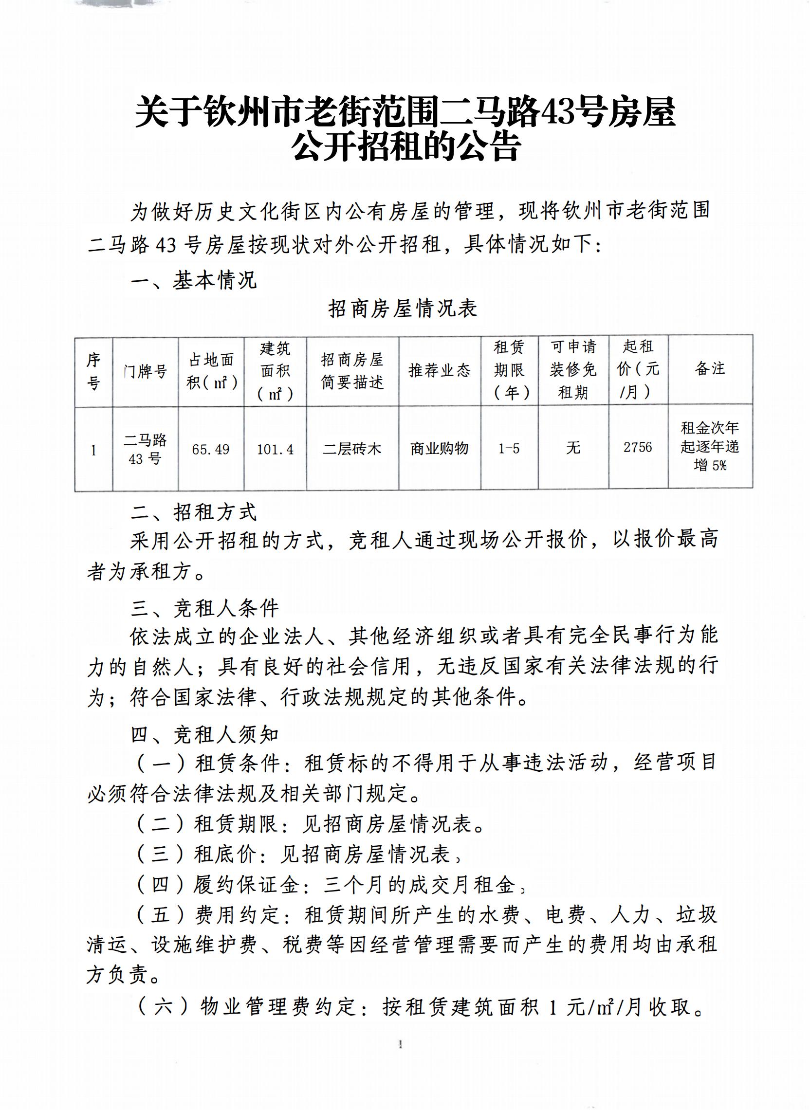 欽州市老街范圍二馬路43號(hào)房屋公開(kāi)招租
