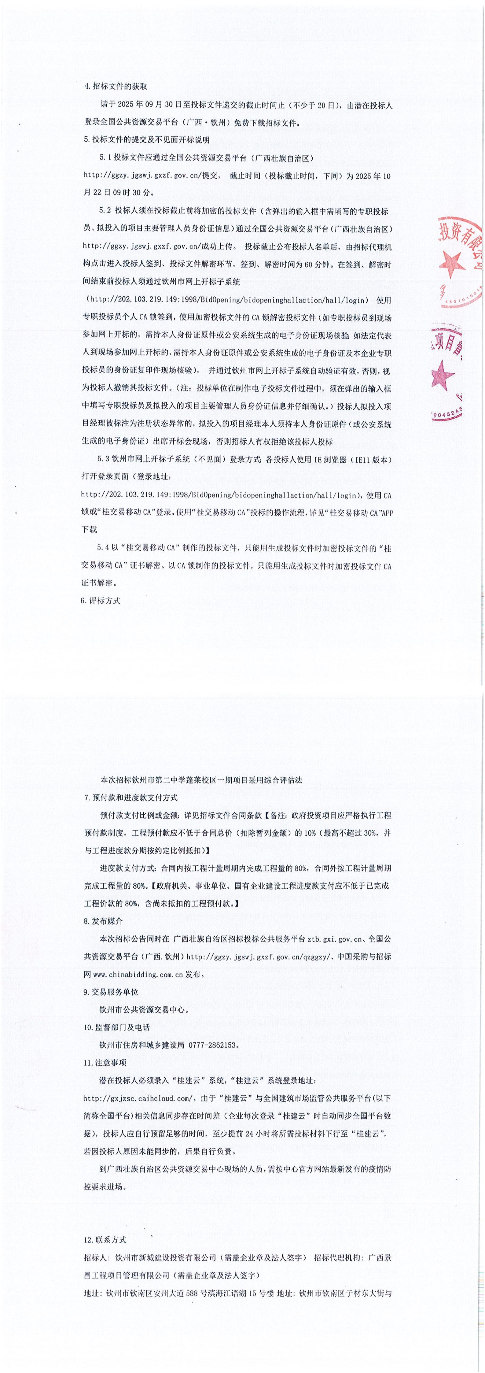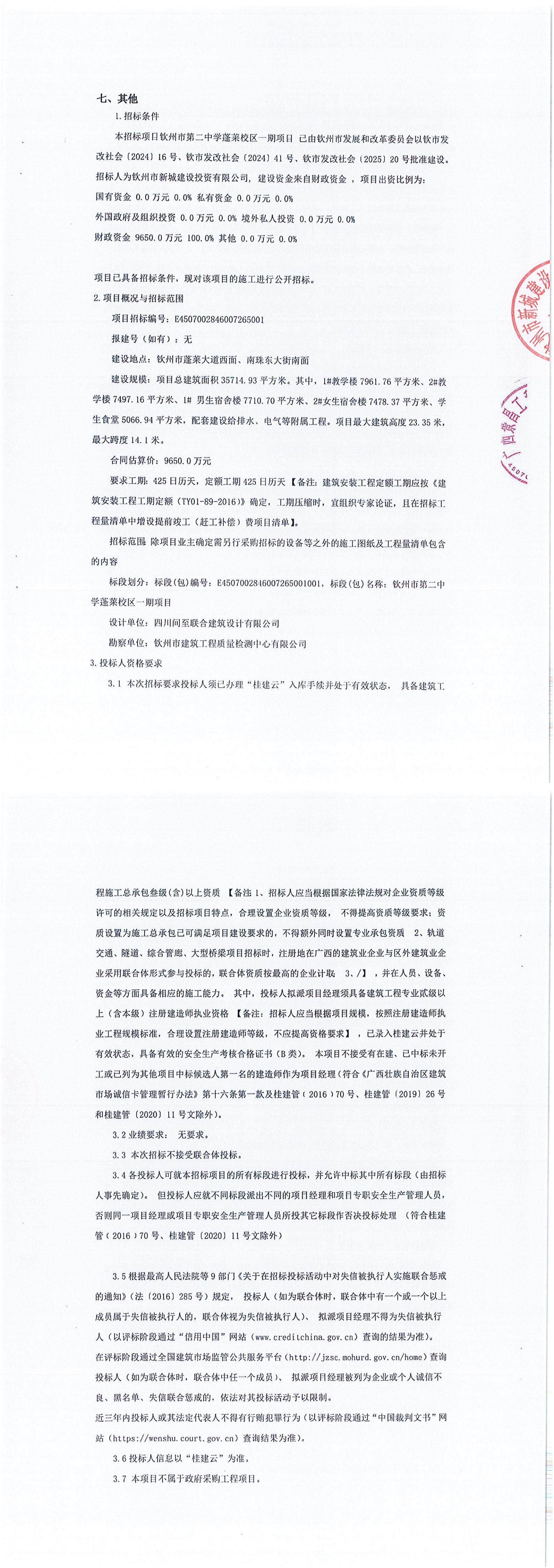 欽州市第二中學(xué)蓬萊校區(qū)一期項(xiàng)目(項(xiàng)目招標(biāo)編號:E4507002846007265001)更正公告(一)