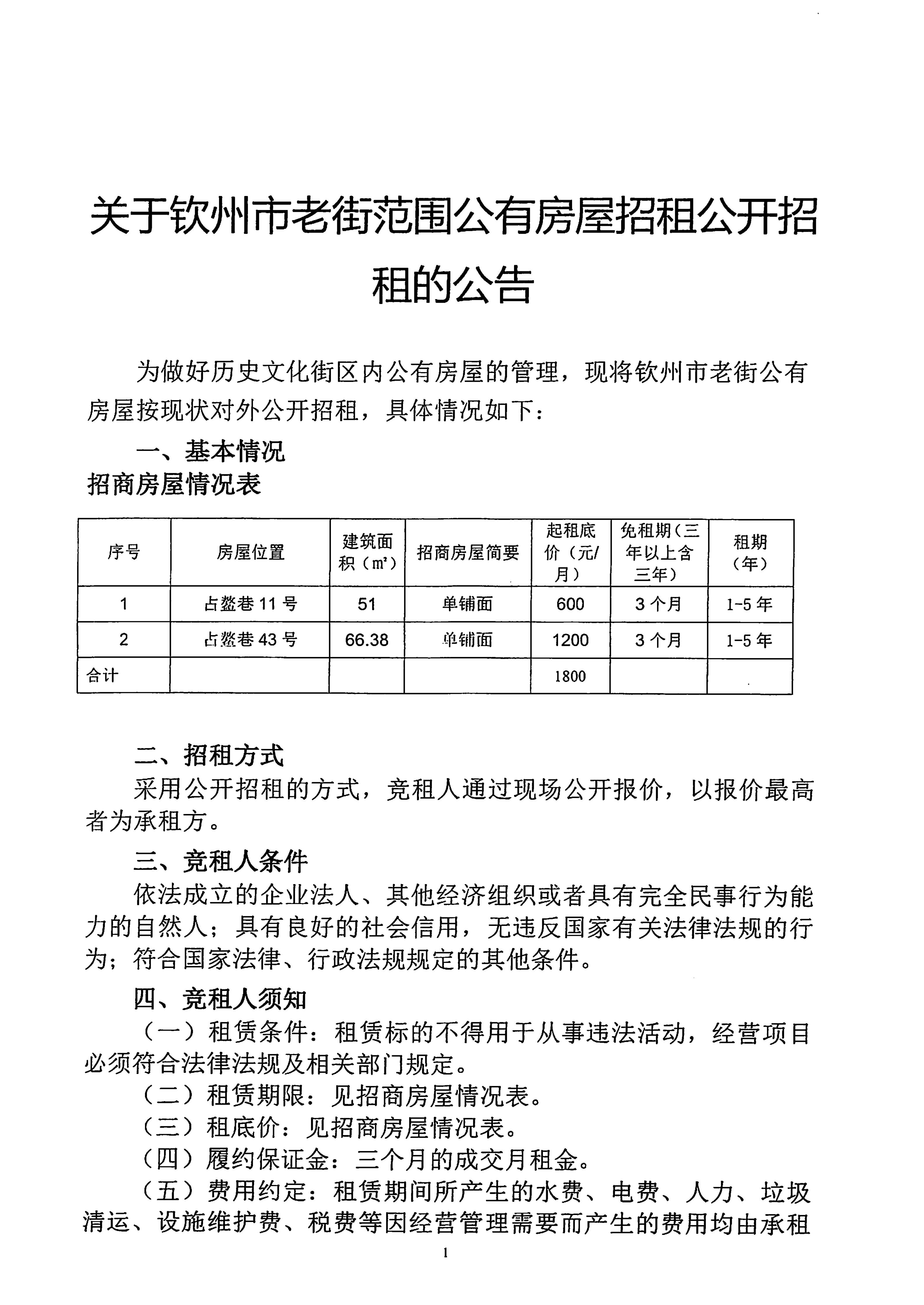 欽州市老街范圍公有房屋公開招租的公告(占鰲巷11號(hào)、占鰲巷43號(hào))